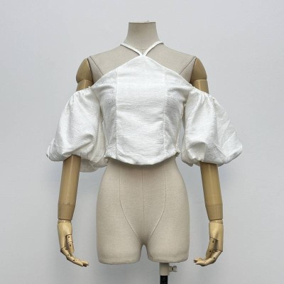 White Halter Off-the-Shoulder Puff Sleeve Cropped Top