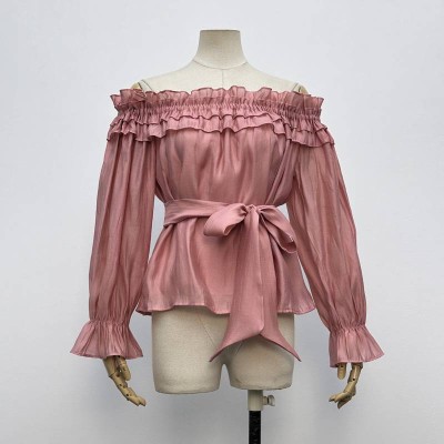 Pink Off-the-shoulder Ruffled Waist-tie Chiffon Top Long Sleeve Fairy Blouse