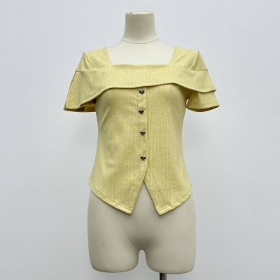 Gentle Yellow Off-Shoulder Heart Button Short Slim Knit Top
