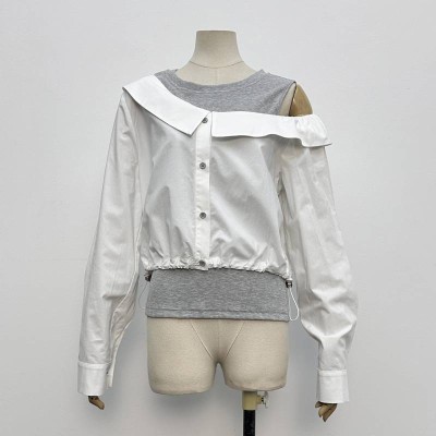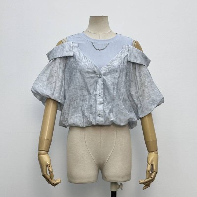 Designer Chain Patchwork Cold-Shoulder Cropped Top Loose Puff Sleeve Fake Two-Piece Chiffon Blouse