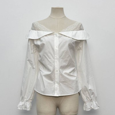 White Lace Patchwork Off-Shoulder Long Sleeve Shirt Temperament One-Shoulder Waist-Cinching Blouse