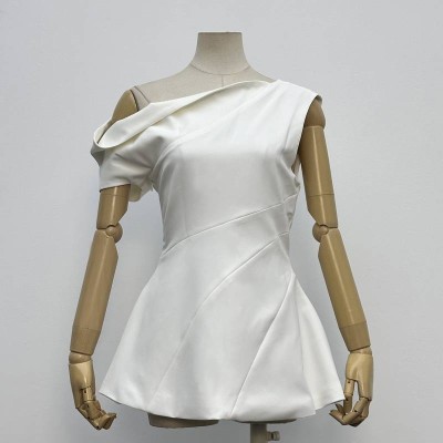 Elegant White Off-shoulder Asymmetric Waist-cinched Top Niche Design Satin Top
