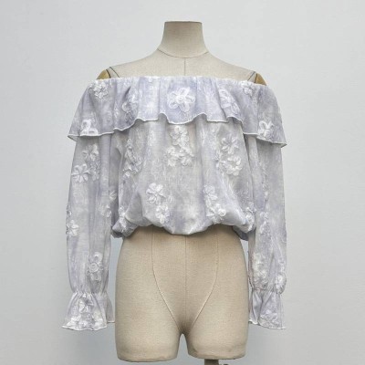 Light Purple 3D Floral Off-Shoulder Ruffle Long Sleeve Cropped Chiffon Top