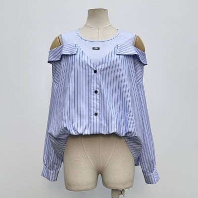 Blue and White Striped Cold Shoulder Patchwork Long Sleeve Top