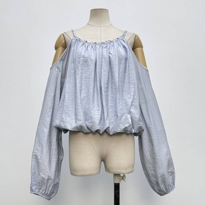 Misty Blue Off-Shoulder Long Sleeve Loose Cropped Top