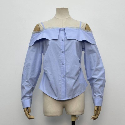 Light Blue Lace Trim Off-the-Shoulder Long Sleeve Shirt Waist Cinched Niche Top