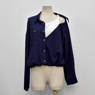 Fake Two-Piece Off-Shoulder Long Sleeve Cropped Top Navy Blue Spliced White Camisole Designer Shirt