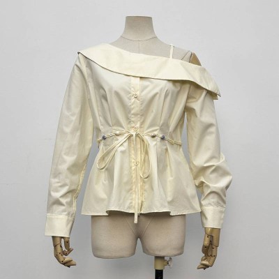 White Off-shoulder Lapel Waist-cinched Long-sleeve Shirt Top
