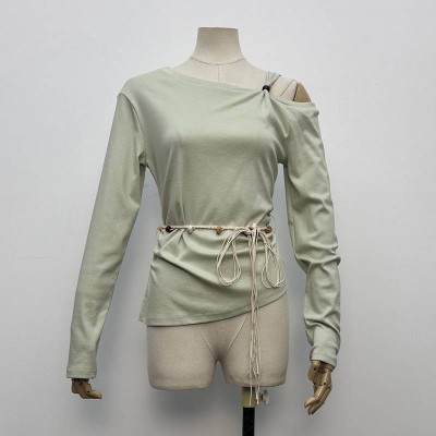 Minimalist Niche Off-Shoulder Long-Sleeve Top, Design Sense Waist-Tie Asymmetrical Neck Knit Base Shirt