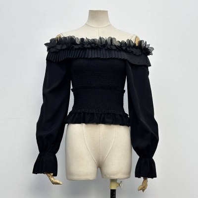 French Style Black Off-the-shoulder Waist-cinching Long-sleeve Top Ruffle Design Niche Short Top