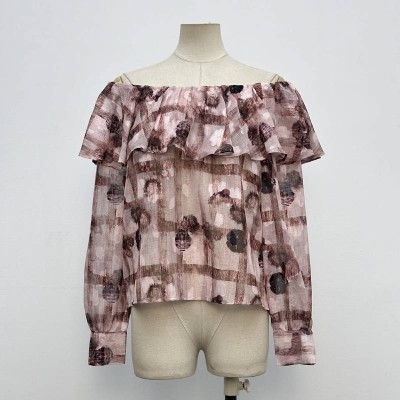 Vintage Plaid Print Off-the-Shoulder Chiffon Top Loose Long Sleeve Ruffled Blouse