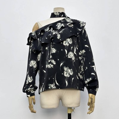 Vintage Print Off-the-shoulder Ruffle Halter Long-sleeve Top