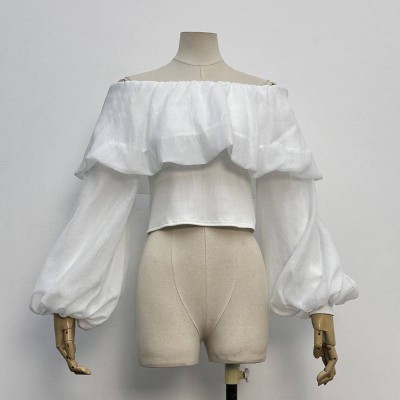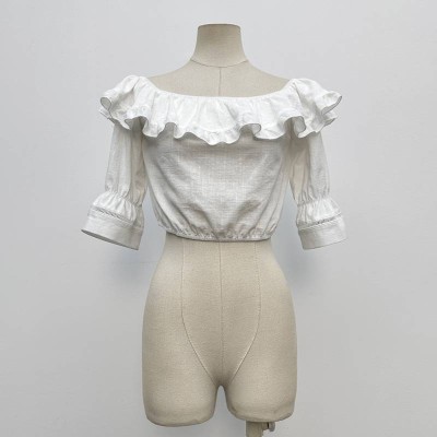 French Ruffle Off-the-shoulder Cropped Top Boat Neck Waist-cinched Half-sleeve White Blouse