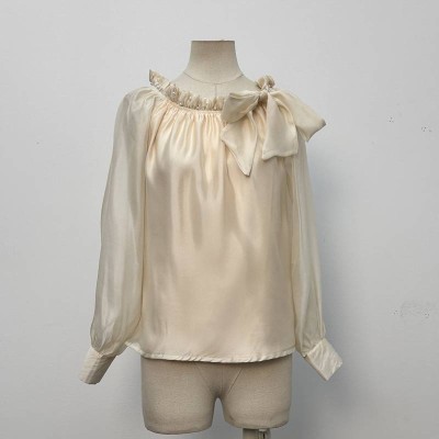 Gentle Pearl Ruffle Bow Off-Shoulder Long Sleeve Satin Top