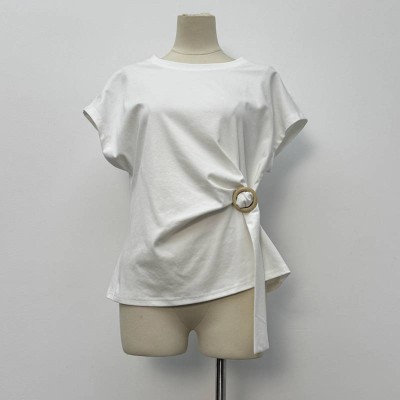 White Loose Short-sleeve T-shirt with Side Buckle Detail
