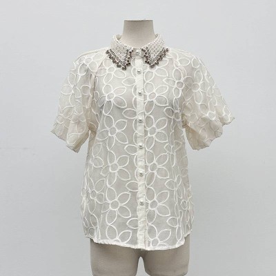 Exquisite Beaded Collar Floral Jacquard Short Sleeve Shirt