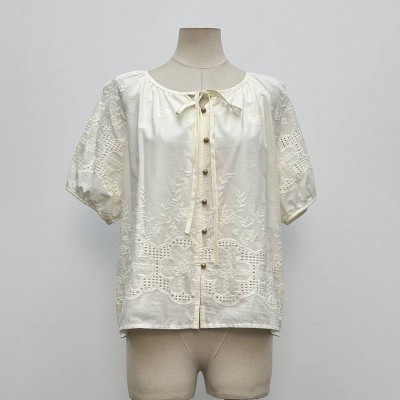 French Embroidered Tie-up Short Sleeve Top Vintage Hollow Round Neck Loose Slim Shirt