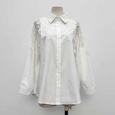 White Lace Patchwork Hollow-out Long-sleeve Shirt Elegant Lapel Loose Blouse