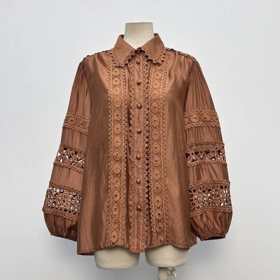 Vintage Hollow Lace Long Sleeve Shirt Elegant Lapel Button-down Brown Blouse