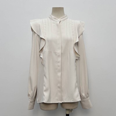 Elegant Stand Collar Ruffle Satin Long Sleeve Shirt