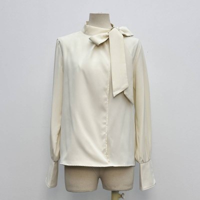 Elegant Bow Tie Stand Collar Shirt Simple Long Sleeve Satin Blouse
