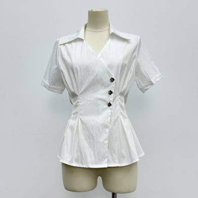 French Style Waist-cinched V-neck Short-sleeve Shirt Women's Slim-fit Pleated Design White Blouse