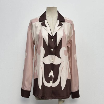 Color Block Printed Lapel Long Sleeve Shirt Retro Silky Casual Blouse