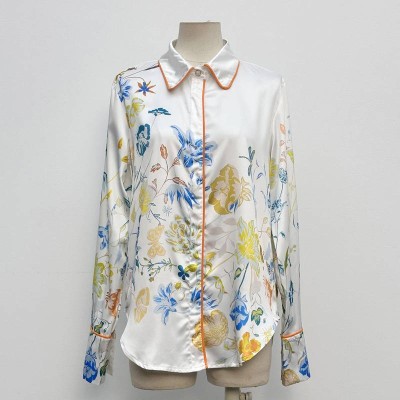Elegant Floral Print Lapel Long-sleeve Shirt Contrast Trim Satin Texture Top