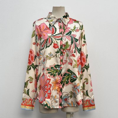 Vintage Floral Print Satin Long Sleeve Shirt Lapel Commuter Temperament Blouse