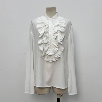 Vintage Stand Collar Ruffled White Shirt Elegant Long Sleeve Loose Blouse