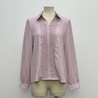 Gentle Pink V-neck Pleated Long Sleeve Shirt Elegant Commuter Chiffon Top