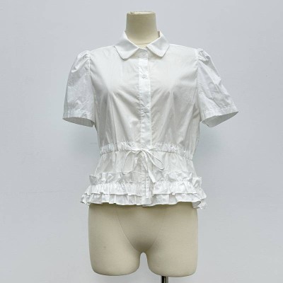 White Lapel Waist Ruffled Short Sleeve Shirt