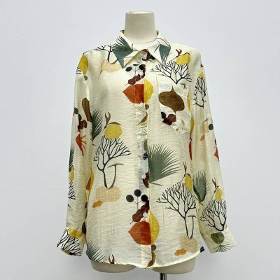 Artistic Plant Print Lapel Long Sleeve Shirt Loose Casual Breathable Blouse