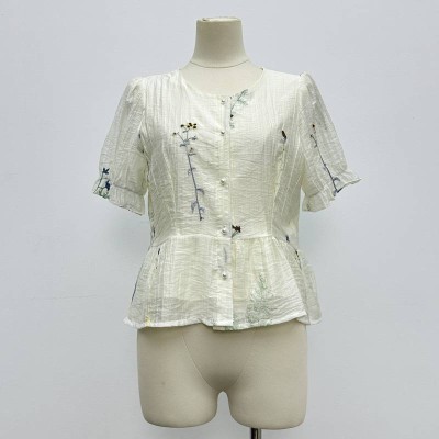 French Style Embroidered Waist-cinched Round Neck Puff Sleeve Short-sleeve Top Elegant Slim Shirt