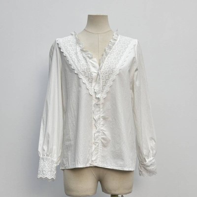 White Lace V-neck Long-sleeve Shirt Gentle Style Loose Slimming Temperament Top