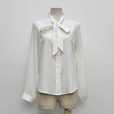 Elegant Bow Tie White Chiffon Shirt Long Sleeve Patchwork Commute Top