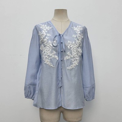 Light Blue Embroidered V-neck Tie Long Sleeve Shirt