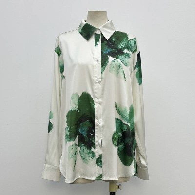 Watercolor Print Lapel Long Sleeve Shirt Elegant Commute Satin Blouse