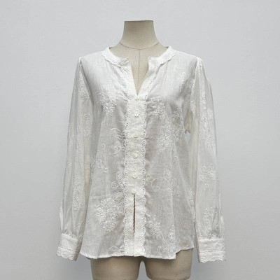 White Embroidered Stand Collar Long Sleeve Shirt Elegant Cotton Breathable Top