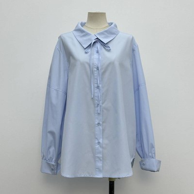 Light Blue Tie-neck Lapel Loose Long-sleeve Shirt