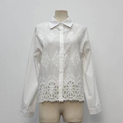 Vintage Embroidered Lapel White Long Sleeve Shirt Elegant Hollow Lace Button-up Top