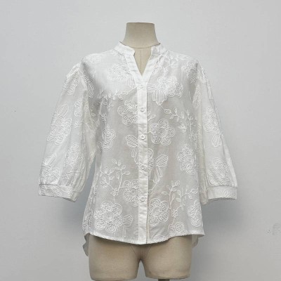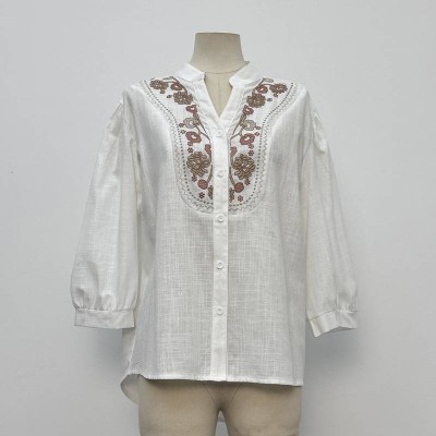 Vintage Embroidery Stand Collar 3/4 Sleeve Shirt Loose Linen Texture White Top