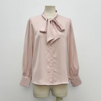 Gentle Pink Bow Tie Neck Long Sleeve Shirt Elegant Commuting Chiffon-like Top