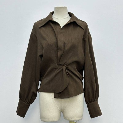 Vintage Brown Lapel Twist Short Shirt Niche Design Long Sleeve Top
