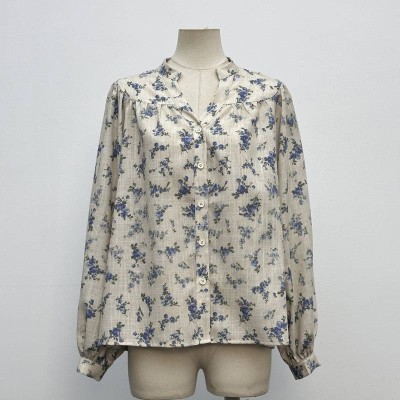 Vintage Blue Floral Stand Collar Long Sleeve Chiffon Shirt Loose Lightweight Breathable Top