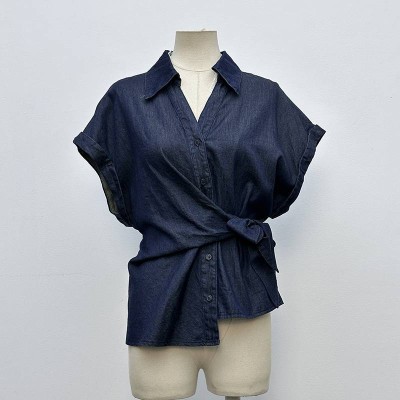 Designer Waist Tie Denim Short Sleeve Shirt Niche V-neck Lapel Blouse