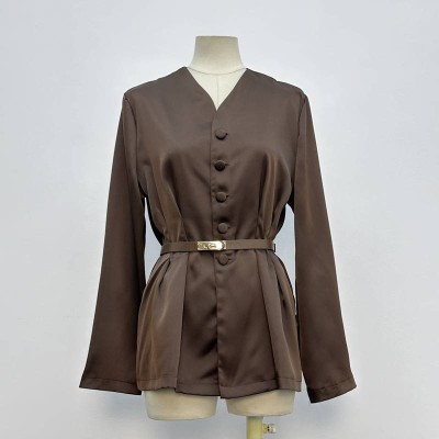 Elegant V-neck Waist-cinching Long-sleeve Satin Top Commute Buttoned Belted Blouse
