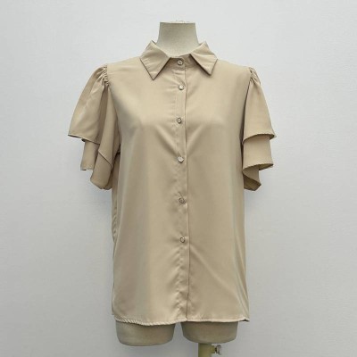 Khaki Lapel Ruffle Short Sleeve Shirt Elegant Commuter Chiffon Top