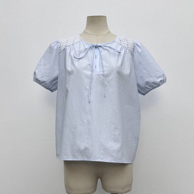 Light Blue Lace Tie Short-sleeve Shirt Loose Casual Top