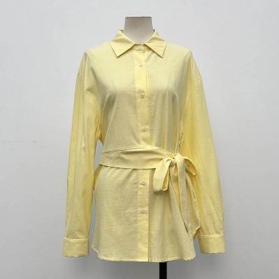 Simple Waist-Tie Long-Sleeve Shirt Lapel Mid-Length Top